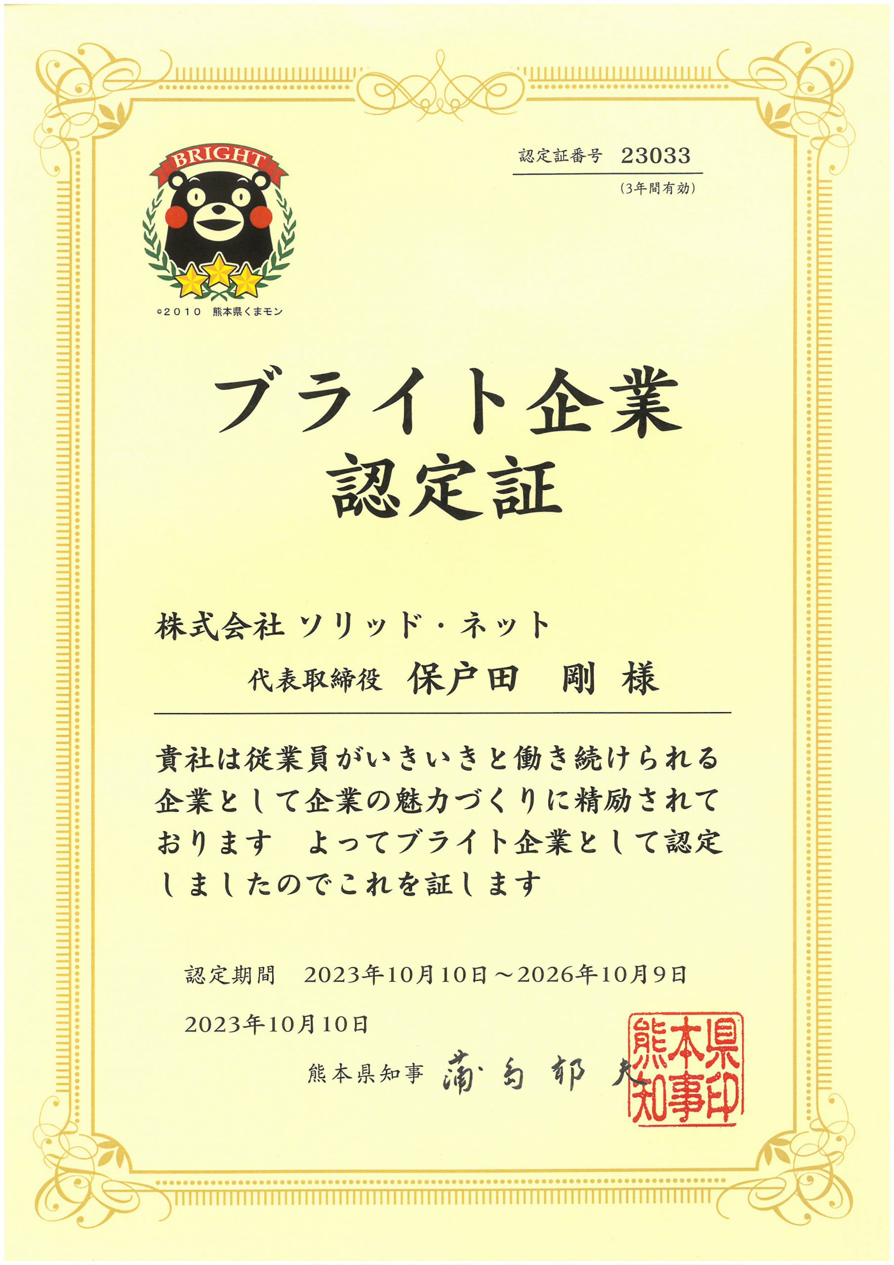 ソリッド・ネットは令和5年度熊本県ブライト企業に認定されました。